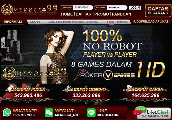 Merdeka99 merupakan Situs pkv games judi qq online terpercaya yang menyediakan permainan dominoqq, bandarq dan poker qq online terbaik. Minimal deposit termurah. Untuk bertransaksi sangatlah mudah karena kami menyediakan layanan transaksi deposit melalui bank-bank lokal Indonesia seperti Bank BCA, BRI, BNI, Mandiri, Danamon. Selain itu, kami juga melayani transkasi deposit melalui Pulsa Telkomsel dengan potongan yang wajar, OVO, gopay, Dana dan Linkaja. Proses Deposit / Withdraw Super Cepat dan aman 100%.